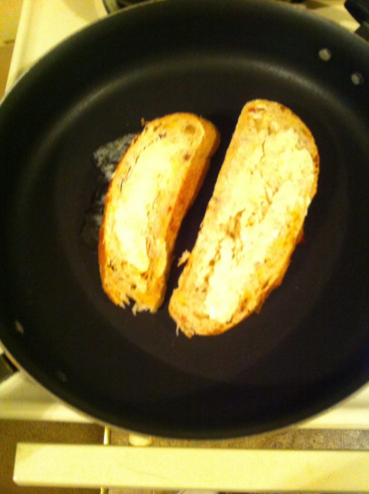 So I used my butter on some nice artisan bread with rosemary, cheese, and bacon in it. Because I don't have a toaster I used a pan on the stove top to brown the bead up.
